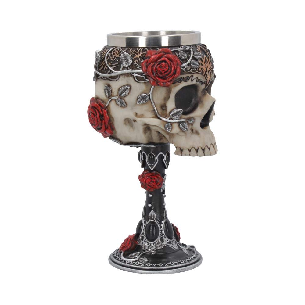 Raise a toast to the reaper with the enchantingly haunting Gothic Roses goblet, designed by alternative brand Nemesis Now's fantastic artists. The black stem and base of this goblet is bordered with silver trim, red roses blooming from silver vines. The silver tendrils creep around the skull that forms the body of the goblet, roses adorning the cheek and temples. Their brow is covered in black, a golden filigree pattern reminiscent of a regal tiara. Cast in the finest resin before being expertly hand-painted, this exquisite goblet comes with a removable stainless steel insert for ease of cleaning.