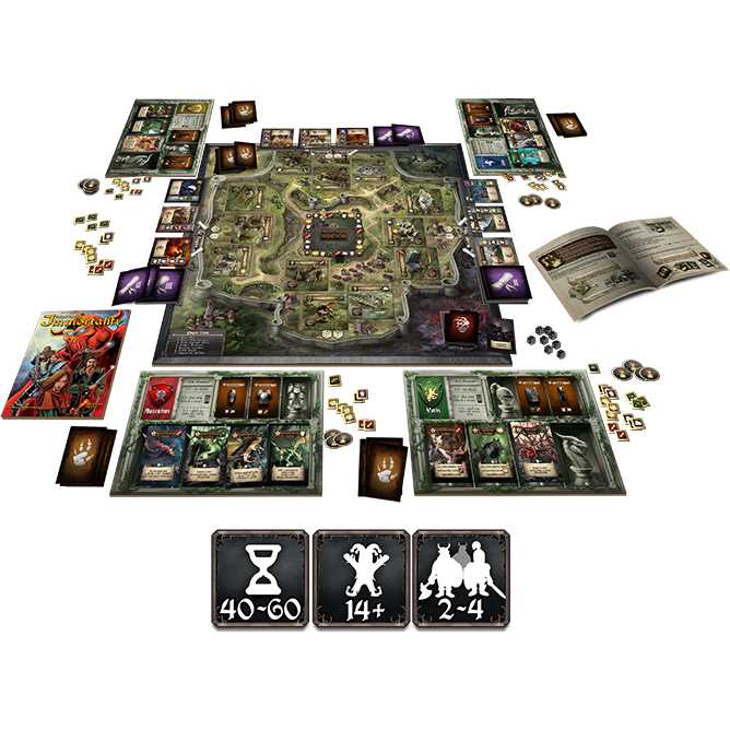 A dark fantasy game of dice-rolling, worker placement and resource management. Players assume the role of powerful noble houses that are trying to fulfill quests and find their legendary heirlooms by gathering resources and forging mighty armies of beasts with variable asymmetric powers. The house with most victory points proves its loyalty to the Emperor and wins the game!