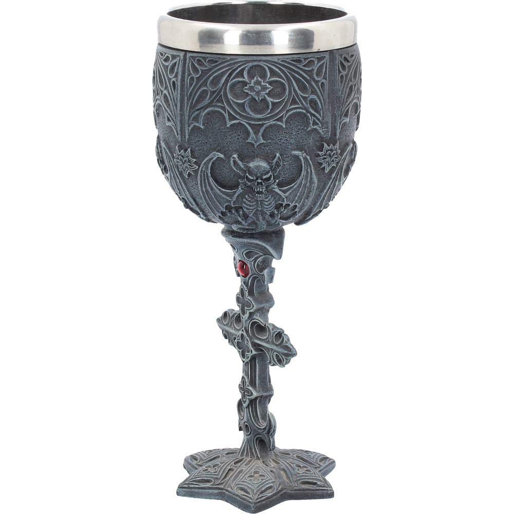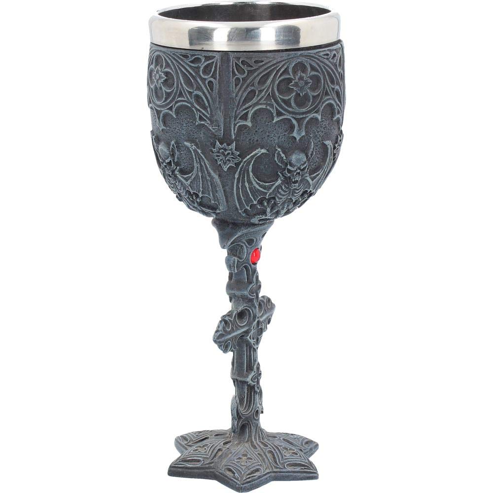 This Gothic goblet was created by alternative brand Nemesis Now's alternative giftware collection. The cup is adorned with large skeletal Vampire bats under cathedral-esque arches. The stem is formed from an ornate cross, whose patterns carry on to the base. A small red jewel is placed just below the cup to add a touch of romance. Cast in the finest resin before being painstakingly hand-painted, this goblet is perfect for anyone who has a passion for blood-sucking monsters.